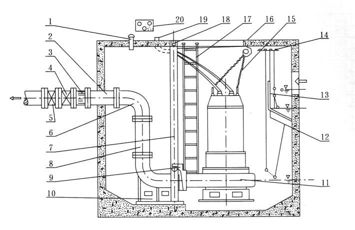 12.浮球開(kai)關(水位開(kai)關)13.隔闆 14.浮(fu)球固定架(jia) 15.小鍊 16.挂鈎(gou) 17.人梯 18.支撐(cheng)架 19.電纜出(chu)線管 20.電機(ji)保護器