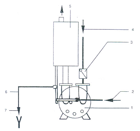 1. 2BV 真空(kong)泵 2. 供水(shui)管 3. 逆止(zhi)閥 4. 吸氣(qi)管 5. 氣水(shui)分離器(qi) 6. 排氣管(guan) 7. 溢水管(guan)